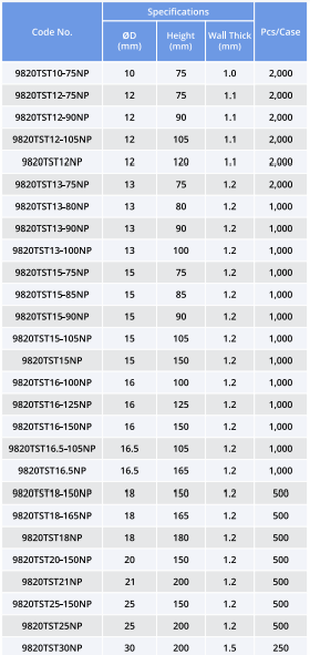 | 10–38 mm | 50–200 mm | 1–2 mm | 3–175 mL | Box 50–400 pcs |